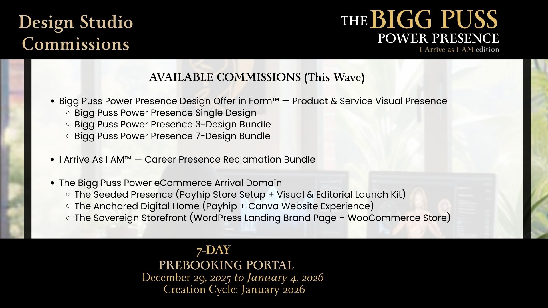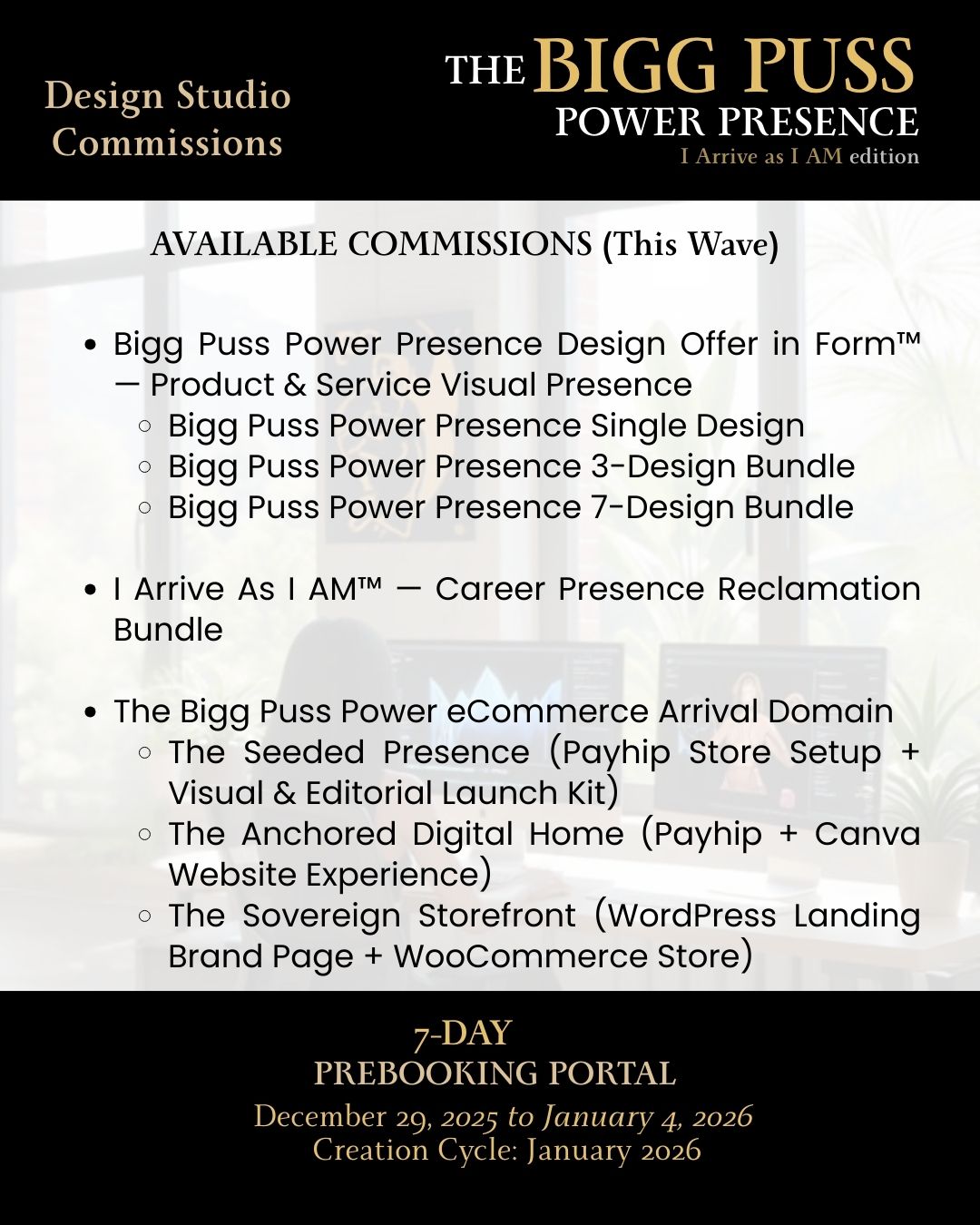 The Bigg Puss Power Presence™ Design Offer in Form delivers custom visual design through flexible single and bundle options, supporting embodied confidence and unmistakable presence. Select from social media, web, digital or physical products, merch, launches, or media covers—each designed to align your visuals with your voice. Created for creatives, shop owners, and founders who are ready to show up fully and be seen as they are.