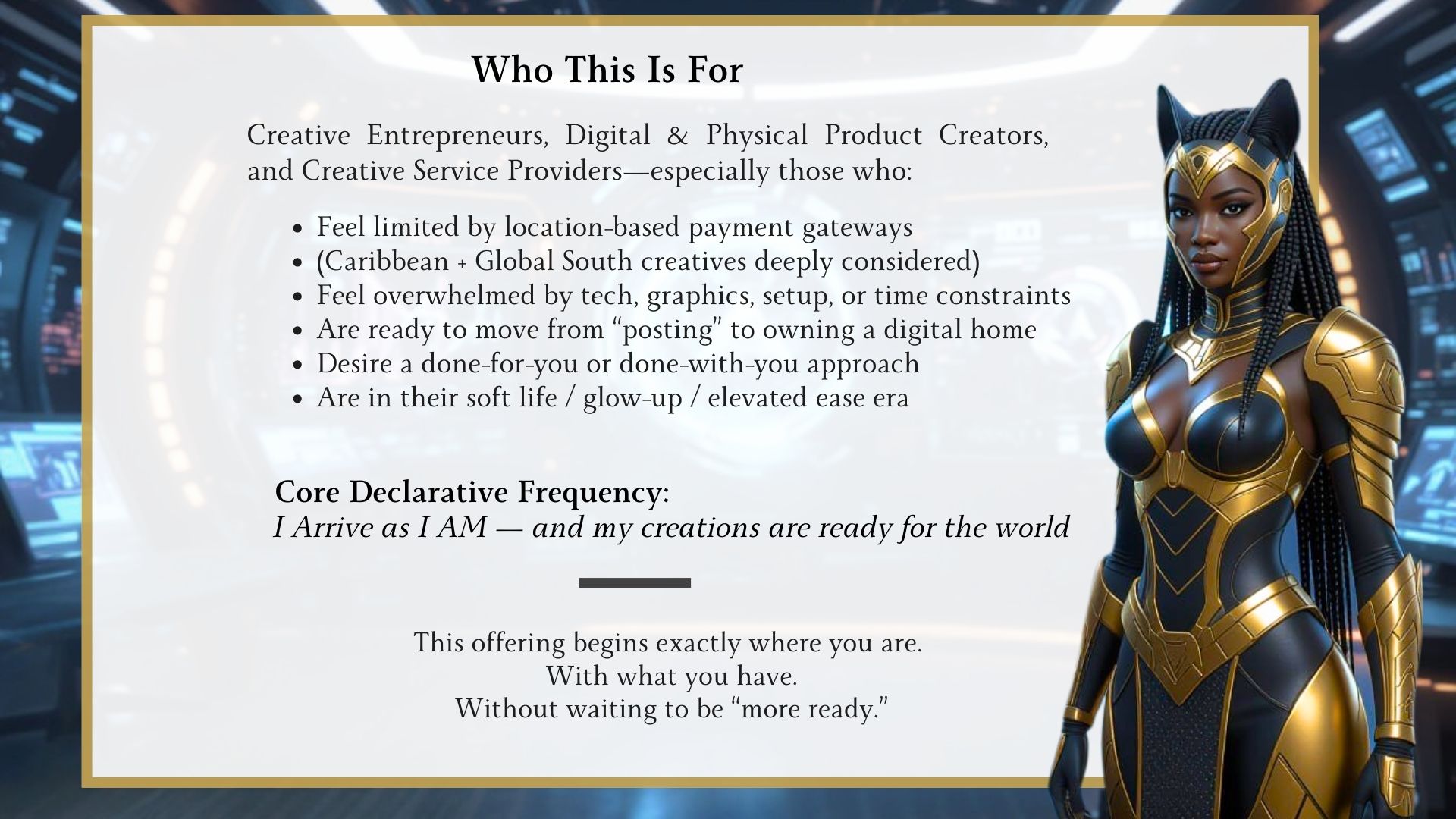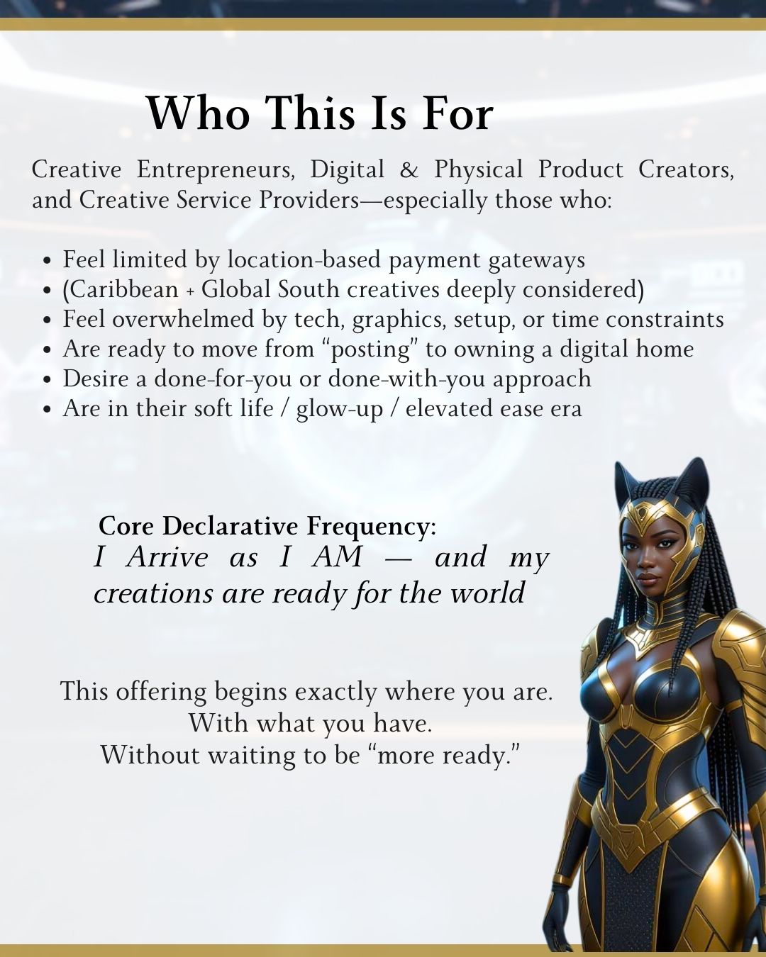 Included across every tier of this offering is The I Arrive As I AM™ – Bigg Puss Confidence in Visibility & Value Resource (PDF), delivered within the execution timeline to support not just the brand you are building, but the person behind it.